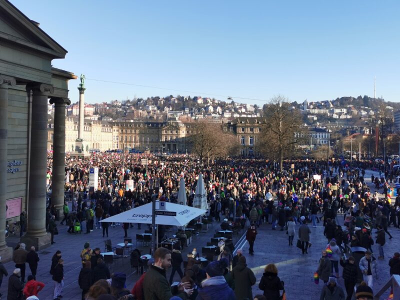 Beruflich in Stuttgart, war für uns klar, dass wir dort teilnehmen mussten und trafen am 20.01.2024 um 14.00 Uhr in Stuttgart auf dem Schlossplatz auf zehntausende andere bei der Kundgebung „Alle zusammen gegen die AfD“. An diesem Tag waren bundesweit hunderttausende Menschen bei Kundgebungen und Demonstrationen und haben ihren Abscheu gegen Rechtsextremismus und auch die – mindestens – rechtspopulistische Partei AfD auf Straßen und Plätze getragen.